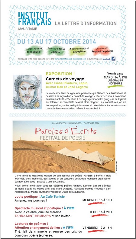 ATTENTION : pour des raisons indépendantes de notre volonté, le rendez-vous Festival Paroles d’écrits (initialement prévu aux dunes Soukouk) du vendredi 17 octobre aura lieu à l’IFM à 16h. sous la khaïma. Merci de votre compréhension.