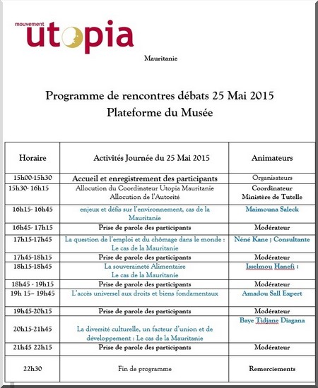 21-05-2015 15:52 - Le Mouvement Utopia Mauritanie réunit un panel d’experts pour parler de l’environnement, de l’emploi et la diversité culturelle