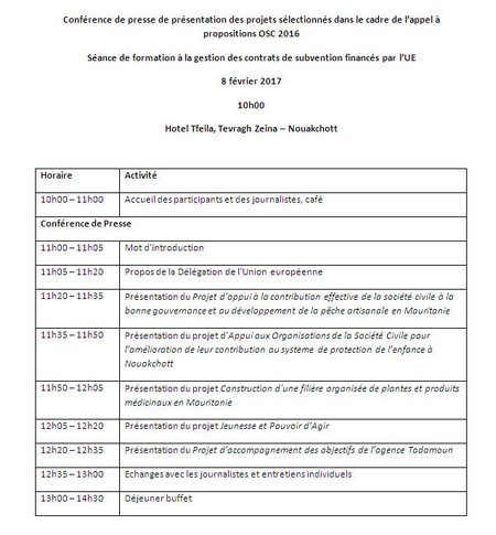 EEAS-NOUAKCHOTT - La Délégation de l'Union européenne en Mauritanie présente ce Mercredi 8 Février 2017 à partir de 10:00, les projets sélectionnés dans le cadre de l’appel à propositions Organisation de la Société Civile (OSC) 2016.