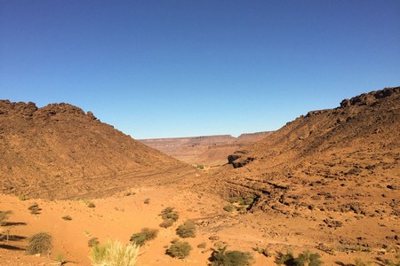 Après le passage de cette montagne, il nous reste 1h30 de marche environ. C’est l’hiver en Mauritanie, mais cela n’empêche pas d’avoir des températures à 30 degrés. Comparé aux 5 degrés grenoblois la différence est agréable.