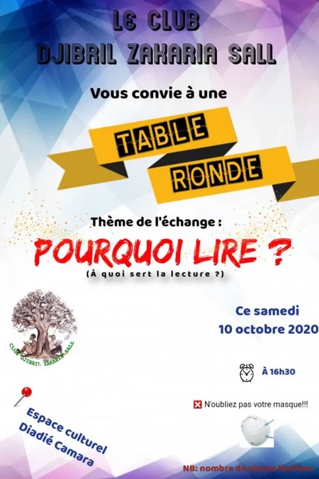 Dans le cadre de ses activités socio-éducatives, le club Djibril Zakaria Sall a l’honneur de vous convier à une table ronde sur le thème: “pourquoi lire? À quoi sert la lecture?”, qui aura lieu ce samedi 10/10/2020 à l’espace culturel Diadie Camara à partir de 16h30.