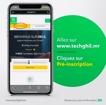 En conséquence, tous les demandeurs d’emploi qui remplissent les conditions susmentionnées et souhaitant profiter de cette opportunité, sont priés de l’exprimer en remplissant le formulaire sur le site de l’Agence Nationale pour l’Emploi « Techghil » : www.techghil.mr
