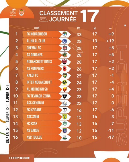 En clôture de la 17ème journée, l’Al-Hilal SC a pulvérisé l’Inter Nouakchott (3-0). Yasir Mozamil ouvrait le score (11'). Peu après (45+2'), Yasir Awad doublait la mise. Le sénégalais El Hadj Madické Kane pliait la rencontre (65'), face à des Intéristes dépassés qui ont fini la rencontre à neuf, suite aux expulsions de Mamadou Gangué et de Doudou Aliène (55’).