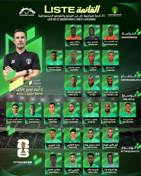 Afrique-sur7 -- Tout comme la plupart des entraîneurs, le sélectionneur de Mauritanie, Aritz López Garai, a dévoilé une liste de 25 joueurs convoqués pour les prochains matchs de qualification pour la Coupe du Monde 2026.